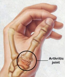 Door verschillende oorzaken (veroudering, letsel, familiaal voorkomen of overbelasting) kan het kraakbeen wegslijten. Dit noemen we arthrose. Het bot op bot contact doet pijn en geeft stijfheid. Dit is een frequente aandoening in de duimbasis waar grote krachten op een klein gewrichtsoppervlak inwerken.